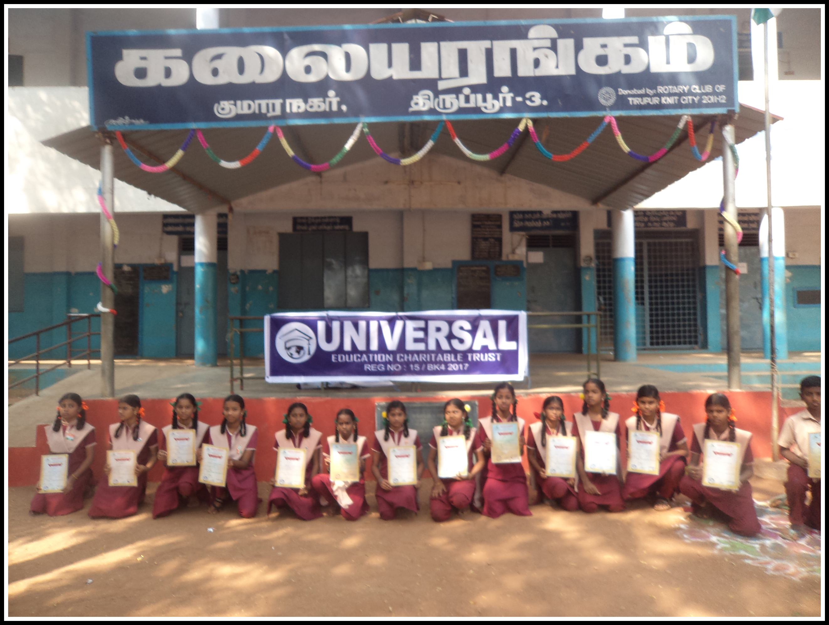 The Universal Education Charitable Trust had conducted Kumar Nagar Government School children Art and Essay competition to Boys and Girls to all the classes. All the students had participated and the best performances students had given testimonials. All the participated students awarded the participation certificates to encourage their interest.The School higher authorities and their oral permission had supported to help the students. The performances and interest were highly measured. The Faculty members and their personal interest to develop the students were highly commanded.. The team of the Faculty members are worth appreciating and well taken care on the whole. Hats off to all Faculty members and higher authorities.The children wanted the help for their physical activities which is most required for their all round personalities trades. Their individual attention were also notices by all the staff members and the head of the Institution is an example to all.We the Universal Education Charitable Trust personally appreciates the Principal and the Faculty members for their special care towards the students development.