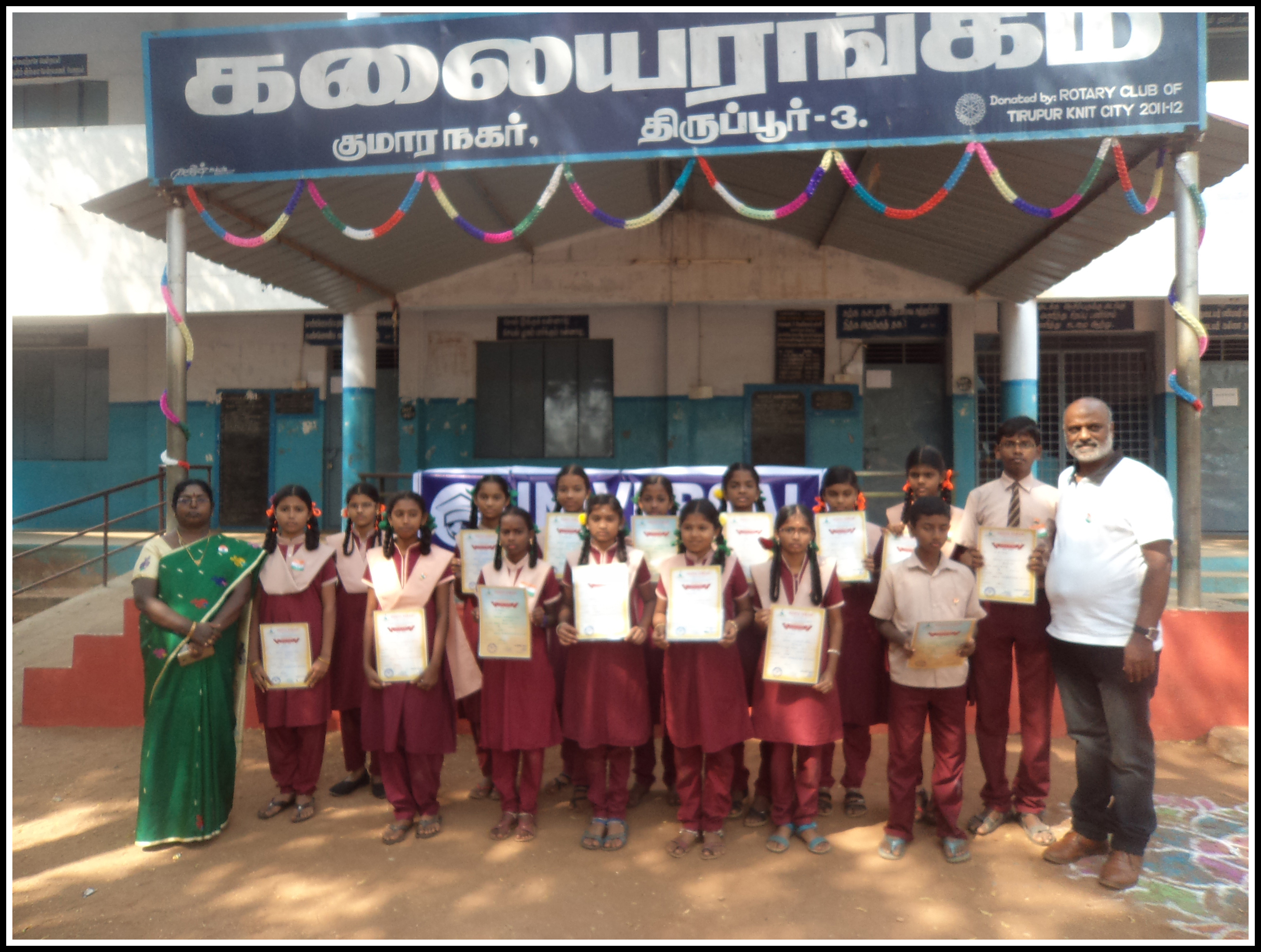 The Universal Education Charitable Trust had conducted Kumar Nagar Government School children Art and Essay competition to Boys and Girls to all the classes. All the students had participated and the best performances students had given testimonials. All the participated students awarded the participation certificates to encourage their interest.The School higher authorities and their oral permission had supported to help the students. The performances and interest were highly measured. The Faculty members and their personal interest to develop the students were highly commanded.. The team of the Faculty members are worth appreciating and well taken care on the whole. Hats off to all Faculty members and higher authorities.The children wanted the help for their physical activities which is most required for their all round personalities trades. Their individual attention were also notices by all the staff members and the head of the Institution is an example to all.We the Universal Education Charitable Trust personally appreciates the Principal and the Faculty members for their special care towards the students development.